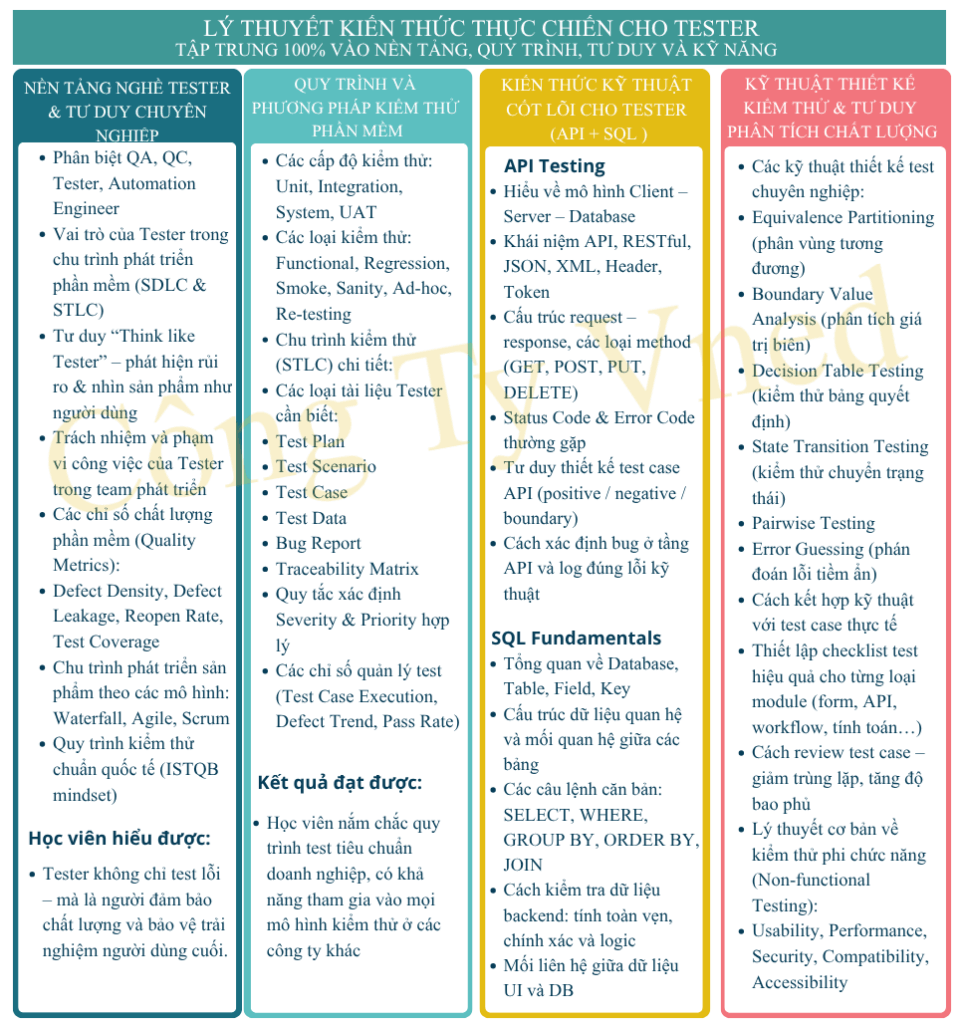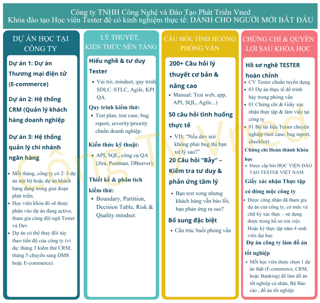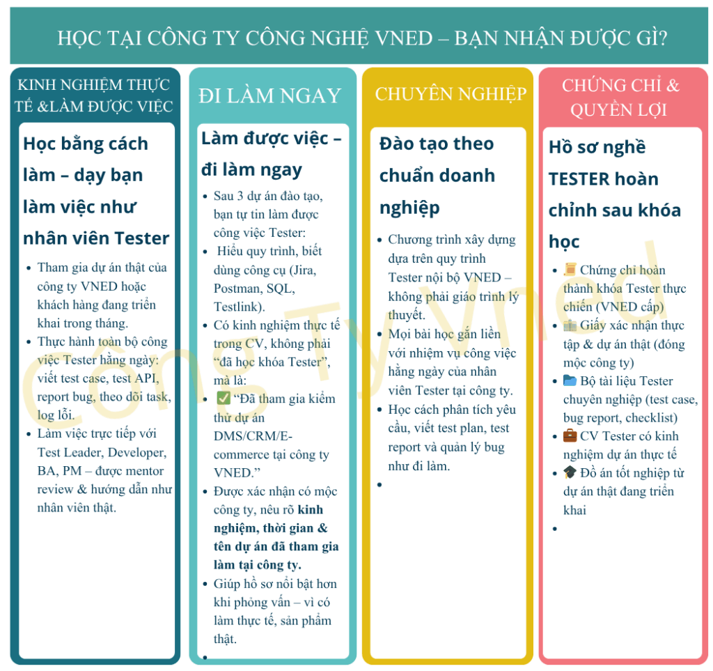 Tester được đào tạo trực tiếp bởi đội ngũ giảng viên & kỹ sư tại VnED. Đã tham gia vào các dự án phần mềm thật trong quá trình học, quen quy trình Agile/Scrum, Jira, TestRail,... Làm được việc ngay – không mất thời gian đào tạo lại